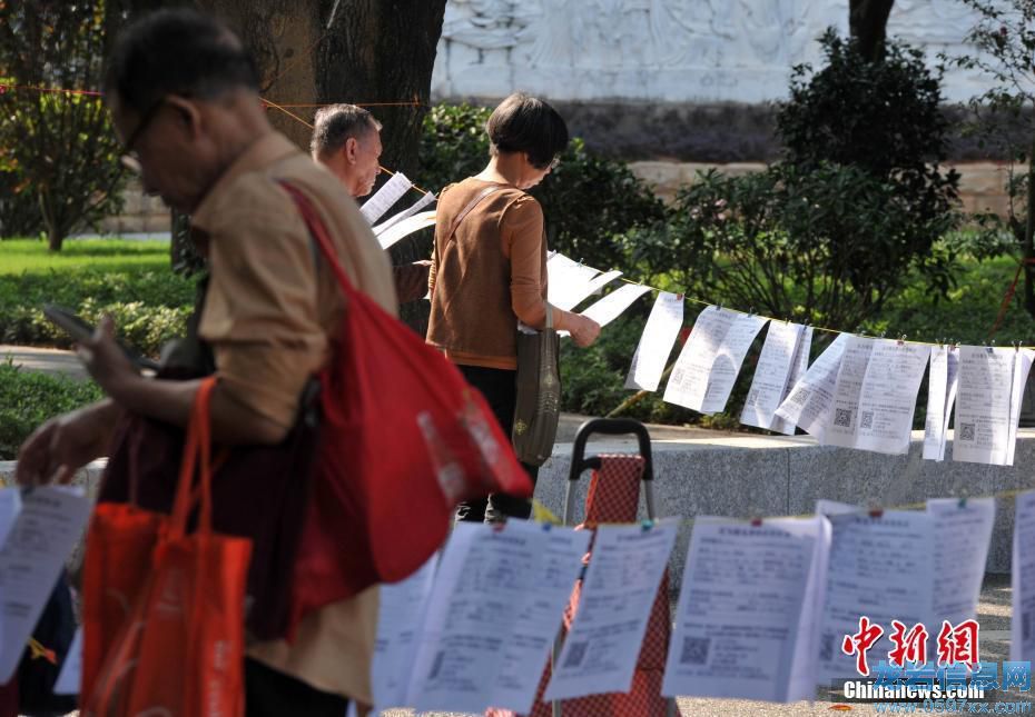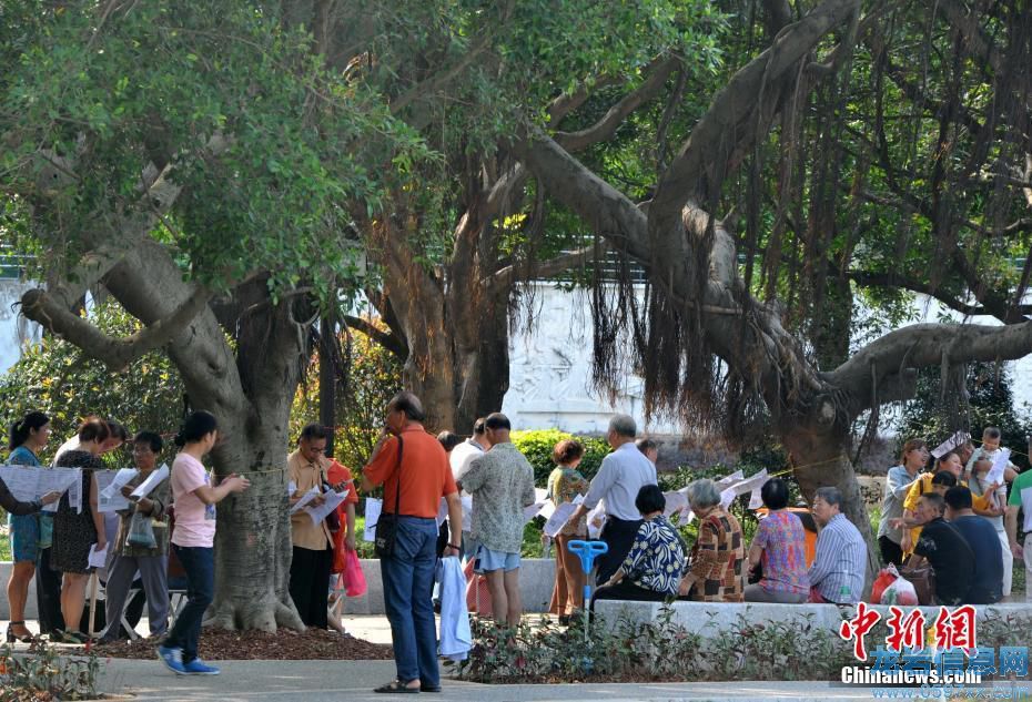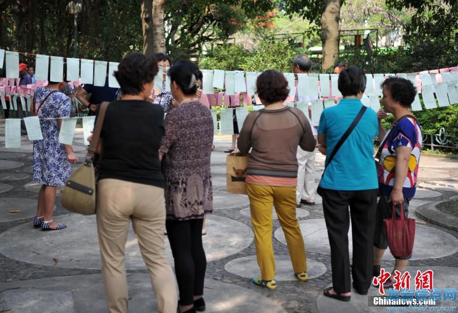 5月6日,每逢周六下午,在廈門中山公園的一片樹蔭下都會人頭攢動,一條條掛著印有許多青年男女征婚資料的紙片吸引了許多未婚青年家人們的關注,他們聚在一起相互交流子女情況,為他們的終生大事牽線搭橋。