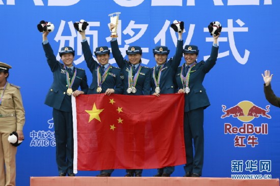 八一跳傘隊5名女選手站在女子四人造型最高領獎臺上(從左至右 運動員劉思維 何宇峰 葉曉莉 裴昱及空中攝影師黃靜)。 周建輝攝影
