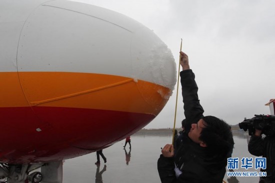 2012年3月19日,ARJ21-700飛機成功的捕捉到一次結冰的氣象條件,設計人員正在測量機頭冰的尺寸。 胡寅聰攝