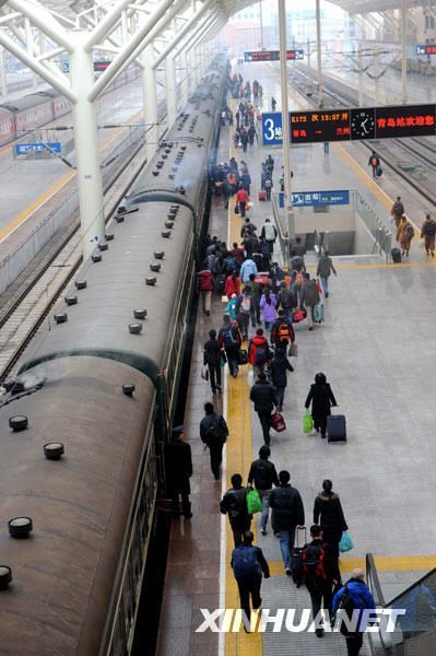 2月19日,旅客在青島火車站乘坐開往蘭州的K172次列車。