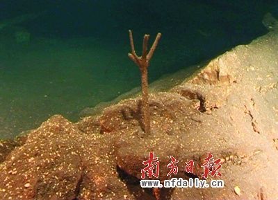 水底保留的古代工匠工作時用的銅燈架。(圖片為西樵山石燕巖水下采石遺址視頻截圖,由董國亮提供。)