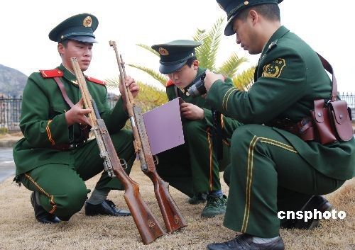 中新網(wǎng)2月20日報道 浙江省臺州市三門縣健跳鎮(zhèn)漁民周德桂近日在海上捕漁作業(yè)時打撈出兩支步槍,上交健跳邊防派出所。民警通過銹跡分析,兩支步槍被原持有者拋入海的時間并不長。圖為邊防官兵展示漁民周姓漁民打撈上來的步槍。中新社發(fā) 郟策 攝