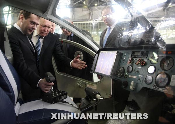 2月20日,在位于俄羅斯伊爾庫茨克州的俄主要飛機制造商之一伊爾庫特公司,俄總統梅德韋杰夫參觀一架飛機的駕駛艙。新華社/路透