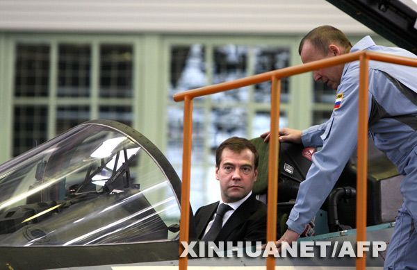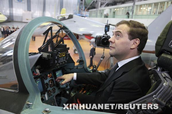 2月20日,在位于俄羅斯伊爾庫茨克州的俄主要飛機制造商之一伊爾庫特公司,俄總統梅德韋杰夫在一架戰斗機的駕駛艙內參觀。新華社/法新
