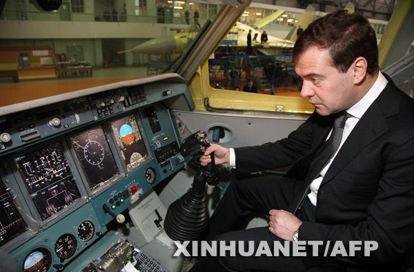 2月20日,在位于俄羅斯伊爾庫茨克州的俄主要飛機制造商之一伊爾庫特公司,俄總統梅德韋杰夫在一架飛機的駕駛艙內參觀。新華社/法新