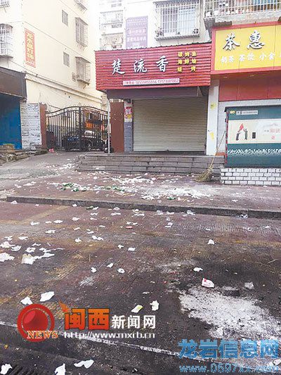 在西陂路(龍巖八中對面),地面上紙巾遍地,油污積存問題嚴重,地磚已變成黑色。