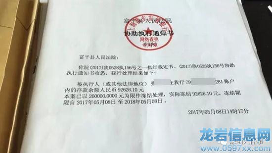 而在到銀行辦理了新卡后,問題仍然無法解決,卡內的近10萬存款根本取不出。更令人驚奇的是,銀行工作人員告訴他,其銀行卡已被富平縣人民法院凍結了,不單賬號內的存款無法支取,還倒欠了16萬多。