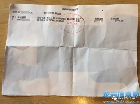 魏小鵬向記者提供一份印戳日期為"20170619"的銀行對私凍結信息查詢的證明,內容是客戶魏小鵬的賬號為7902*****4281在2017年5月8日(凍結日期)被凍結,凍結金額為260000.00,實凍金額為96559.85,凍結期為一年。他表示,這是該銀行總行給他發的證明,但銀行表示凍結賬號的不是銀行而是富平縣人民法院通過法院系統進行凍結的,與銀行并沒有關系。