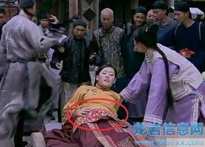 在孕婦快要分娩時,平躺在板車上的時候,肚子上的道具都露餡了。網友也真是好眼力,這也能發現。